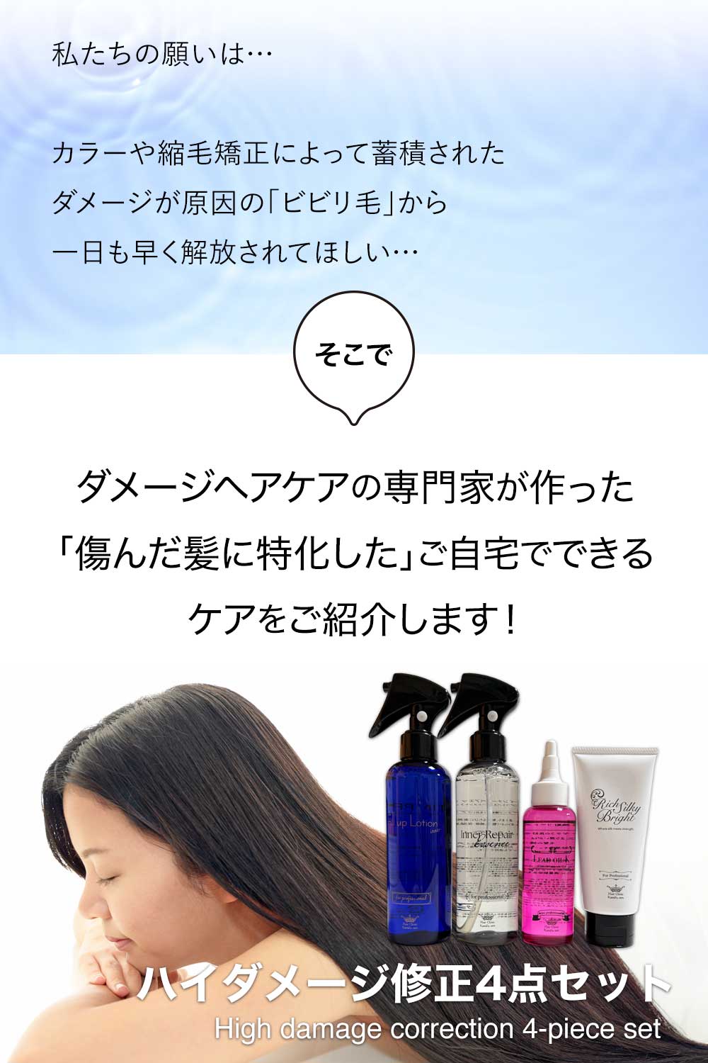 >ハイダメージ修正セットを使用して、ビビり毛がどんどん落ち着いてきました。市販品で色んな事をしてもダメだったので、切ろうかと諦めていたのですが、思い切って購入して本当に良かったです。毎日が明るくなりますね。素晴らしい商品を作って頂き心から感謝しています。髪の悩みを通して、その人の日々も変えてくれる・・・